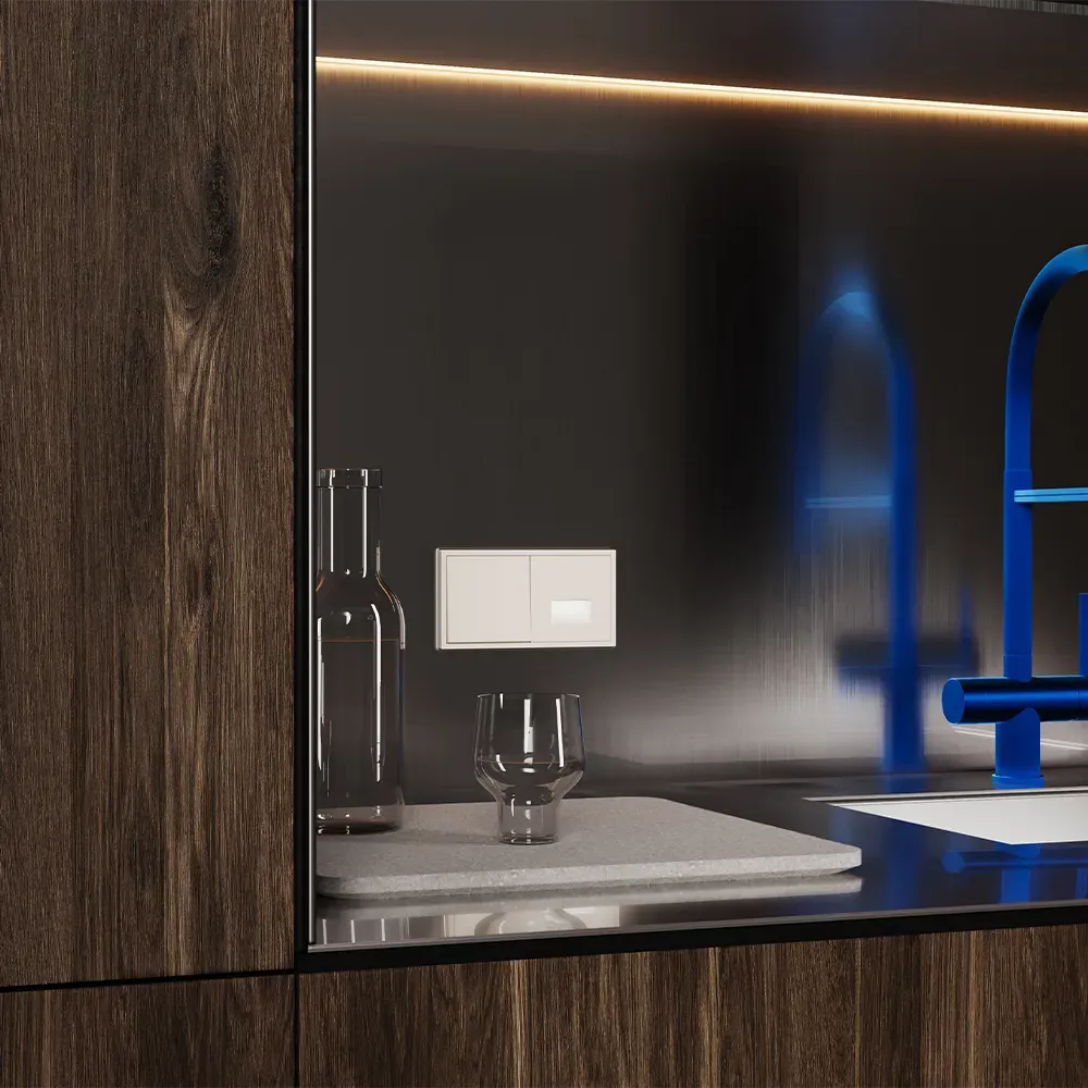 Перекрёстный переключатель полностью совместим с пластиковыми и стеклянными рамками той же серии и гармонично вписывается в любую композицию из розеток, выключателей и других устройств VOLTUM S70.